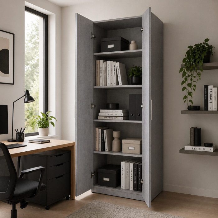 BAMBEY - Armadio 2 ante e 5 ripiani L69xP35xH200 cm effetto Cemento