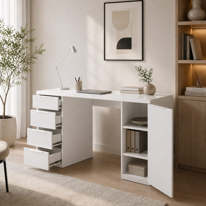 BAMBEY - Scrivania 4 cassetti 1 anta L146 x P60 x H75 cm cm Bianco Opaco