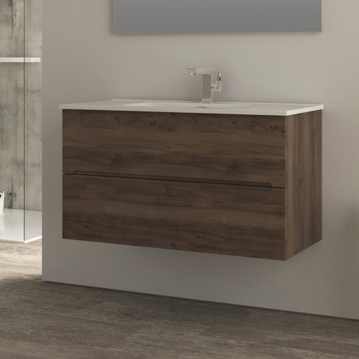 KIM - Mobile bagno sospeso 100 cm 2 cassetti soft-close, legno noce, bagni moderni, lavabo in...