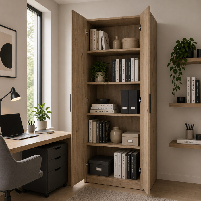 L'armadio Podor si distingue per il suo design moderno e di tendenza, caratterizzato dal contrasto tra il fronte in finitura rovere artisan e la struttura effetto spatolato antracite. Questa combinazione dona un aspetto industriale e raffinato, perfetto per ambienti contemporanei. Dotato di 2 ante a battente con maniglia verticale nera, l'armadio offre uno spazio interno versatile, ideale per essere utilizzato come guardaroba compatto, ripostiglio organizzato o dispensa multiuso. Semplice da abbinare e pratico da utilizzare, Podor è la scelta perfetta per chi cerca ordine e carattere in un unico mobile.