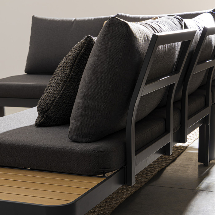 Il salotto da giardino Narelle è una soluzione di arredo moderna e funzionale, pensata per chi desidera vivere gli spazi outdoor con stile e comodità. Composto da un ampio divano angolare modulare e da un tavolino coordinato, Narelle offre tutto il necessario per momenti di relax all’aperto. La struttura in alluminio verniciato antracite assicura resistenza agli agenti atmosferici, mentre i piani laterali e il tavolino sono rifiniti con effetto legno per un tocco naturale e raffinato. I cuscini grigio scuro, spessi e imbottiti, garantiscono un’ottima seduta e sono sfoderabili per una facile manutenzione.
