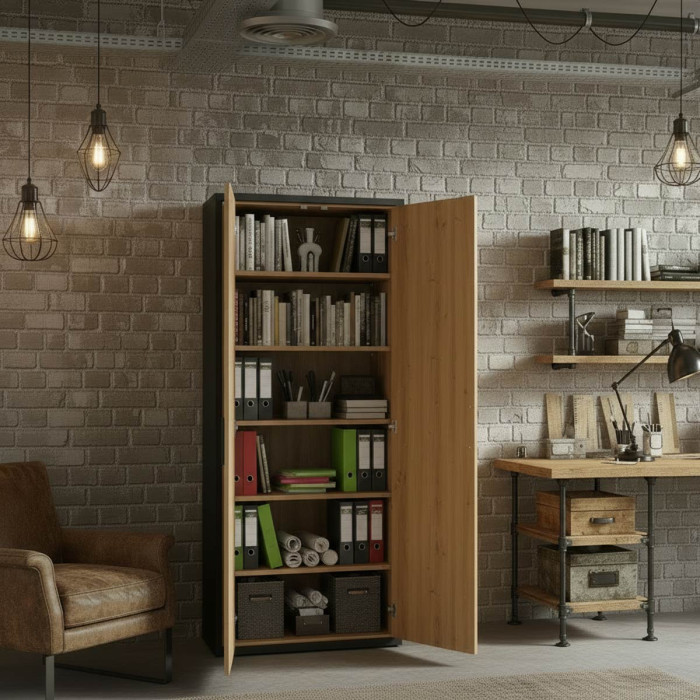 L'armadio Podor si distingue per il suo design moderno e di tendenza, caratterizzato dal contrasto tra il fronte in finitura rovere artisan e la struttura effetto spatolato antracite. Questa combinazione dona un aspetto industriale e raffinato, perfetto per ambienti contemporanei. Dotato di 2 ante a battente con maniglia verticale nera, l'armadio offre uno spazio interno versatile, ideale per essere utilizzato come guardaroba compatto, ripostiglio organizzato o dispensa multiuso. Semplice da abbinare e pratico da utilizzare, Podor è la scelta perfetta per chi cerca ordine e carattere in un unico mobile.