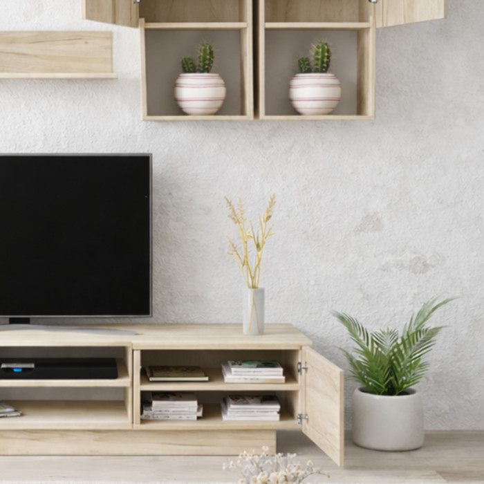 La parete attrezzata economica porta TV Febe è una soluzione elegante e funzionale pensata per arredare la zona giorno con stile naturale e moderno. Caratterizzato da una struttura in finitura rovere chiaro, si distingue per le sue linee essenziali e il design compatto, ideale anche per spazi contenuti. La composizione include una base porta TV bassa con due vani chiusi laterali, perfetti per riporre accessori, telecomandi o oggetti quotidiani, e una mensola centrale aperta adatta a decoder, consolle o lettori multimediali. Nella parte superiore troviamo una mensola a parete e due pensili, entrambi in coordinato, che offrono ulteriore spazio contenitivo e decorativo, mantenendo la coerenza stilistica dell’intera parete.