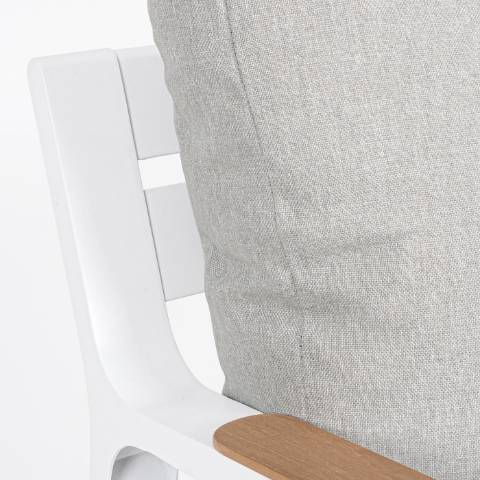 Ernst è un salotto da esterno raffinato e contemporaneo, ideale per valorizzare terrazzi, verande e giardini con uno stile elegante e sobrio. La struttura in alluminio verniciato a polvere di colore bianco è leggera ma resistente, perfetta per affrontare le intemperie senza rinunciare al design. I braccioli e il piano del tavolino sono impreziositi da inserti effetto legno, che donano un tocco naturale e caldo al complesso.