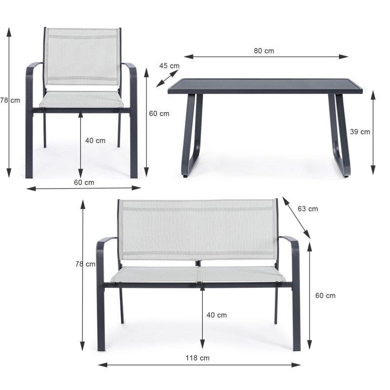 Arent è il salotto da esterni ideale per chi cerca funzionalità, comodità e design moderno in un unico prodotto. Realizzato con una struttura in metallo resistente e sedute in textilene traspirante, offre un’eccellente durata all’aperto e una manutenzione minima. Il set si compone di un divanetto a due posti, due poltroncine con braccioli e un tavolino basso con piano in vetro, perfetti per rilassarsi in giardino, terrazza o balcone. Le linee essenziali e l’estetica minimal si integrano perfettamente in ogni contesto outdoor.