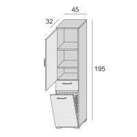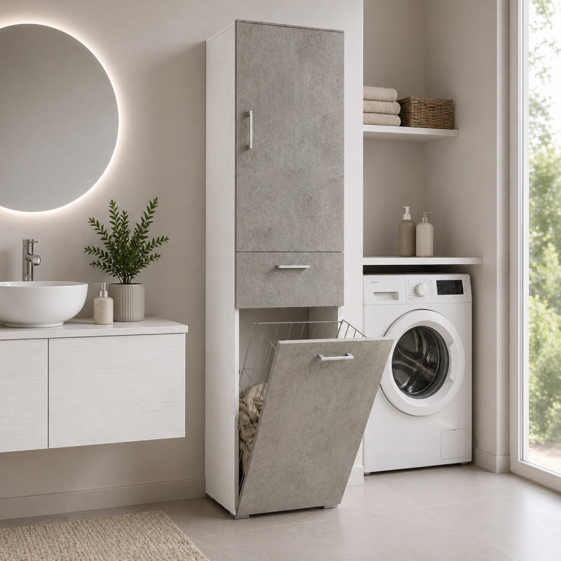 La colonna porta biancheria Laundrycompos è un mobile salvaspazio dal design moderno, pensato per ambienti funzionali come lavanderie e bagni. La sua struttura verticale e compatta consente di ottimizzare lo spazio senza rinunciare alla capienza. È composta da un vano superiore con anta battente, perfetto per riporre detersivi, accessori per la pulizia o piccoli oggetti, un cassetto centrale utile per avere a portata di mano ciò che serve quotidianamente, e un pratico vano inferiore basculante con cestello in metallo, ideale per contenere biancheria o piccoli capi da lavare. Il cestello basculante è progettato per un facile accesso e garantisce anche una buona ventilazione. Le maniglie in ABS, semplici ed ergonomiche, si integrano con lo stile sobrio del mobile.