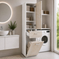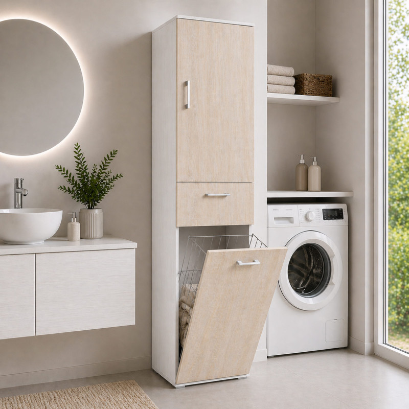 La colonna porta biancheria Laundrycompos è un mobile salvaspazio dal design moderno, pensato per ambienti funzionali come lavanderie e bagni. La sua struttura verticale e compatta consente di ottimizzare lo spazio senza rinunciare alla capienza. È composta da un vano superiore con anta battente, perfetto per riporre detersivi, accessori per la pulizia o piccoli oggetti, un cassetto centrale utile per avere a portata di mano ciò che serve quotidianamente, e un pratico vano inferiore basculante con cestello in metallo, ideale per contenere biancheria o piccoli capi da lavare. Il cestello basculante è progettato per un facile accesso e garantisce anche una buona ventilazione. Le maniglie in ABS, semplici ed ergonomiche, si integrano con lo stile sobrio del mobile.