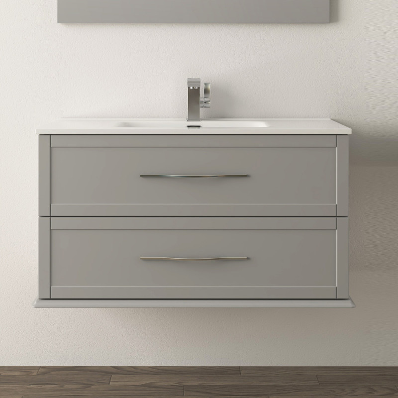 TED - Mobile bagno contemporaneo 100 cm lavabo ceramica, specchio e applique, 2 cassetti maniglie cromate - Grigio Nuvola