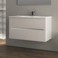KIM - Mobile bagno sospeso 100 cm 2 cassetti soft-close, bianco opaco, bagni moderni, lavabo in ceramica e specchio con applique