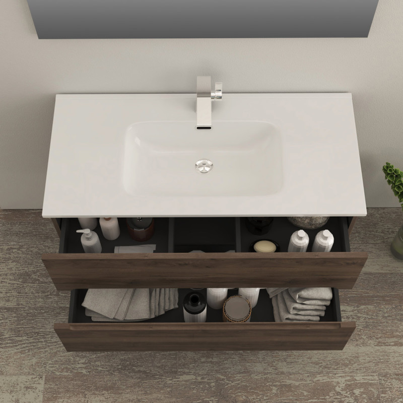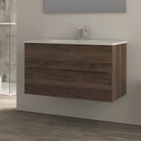 KIM - Mobile bagno sospeso 100 cm 2 cassetti soft-close, legno noce, bagni moderni, lavabo in ceramica e specchio con applique