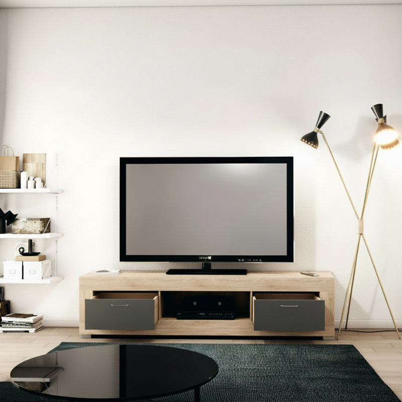 I mobili porta TV Damian con frontali grigio scuro opaco e struttura in rovere natural, presenta un design sobrio e moderno. Dispone di due cassetti laterali, una mensola centrale per dispositivi elettronici e un ampio piano superiore. La combinazione di colori lo rende facilmente abbinabile sia ad ambienti caldi che a contesti più neutri, perfetto per chi cerca funzionalità ed estetica equilibrata in un mobile compatto.