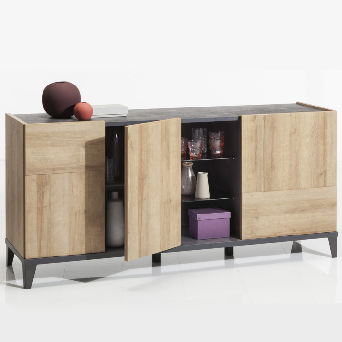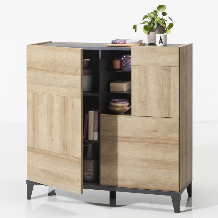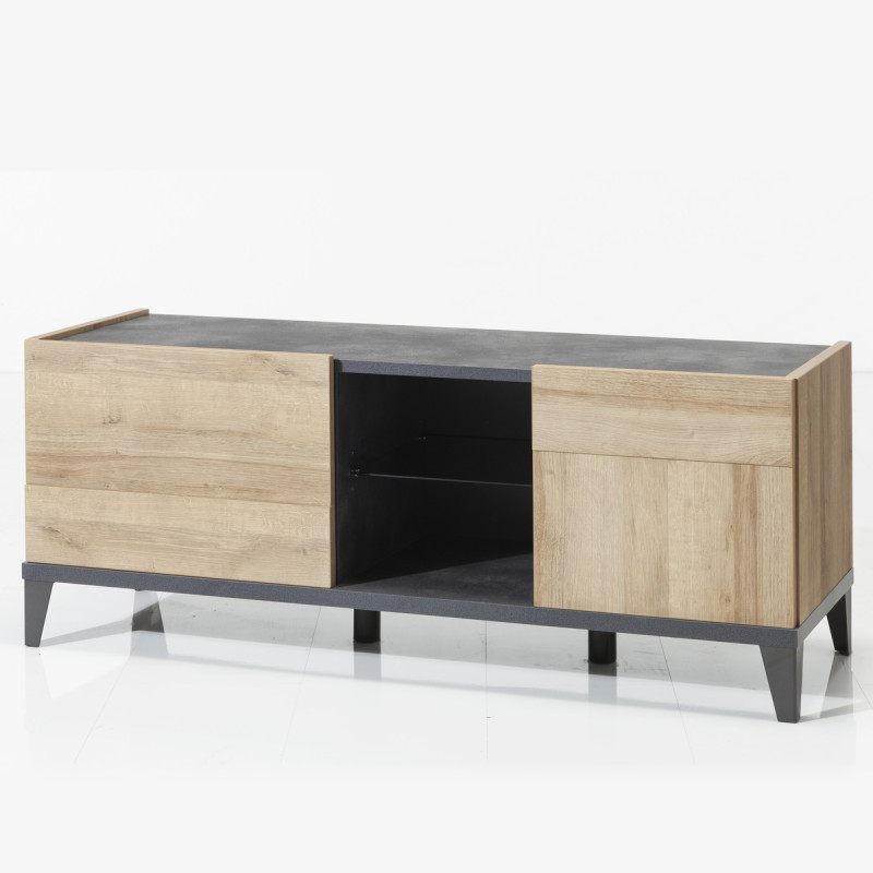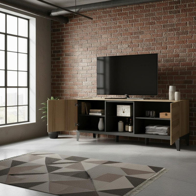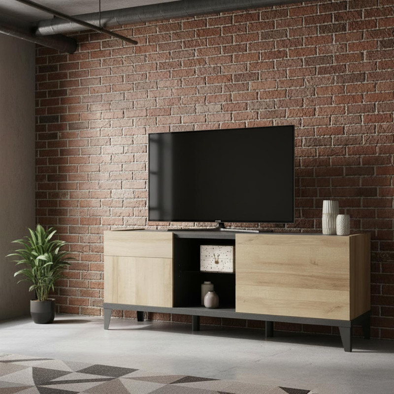 Il mobile porta TV Bloom si caratterizza per un design moderno e deciso, che unisce la calda finitura rovere naturale con dettagli in antracite opaco. È dotato di due ante laterali per riporre oggetti, e uno spazio aperto centrale ideale per decoder o consolle. La struttura solida e i piedini alti donano slancio e un look contemporaneo. Perfetto per ambienti industriali o urban-style.