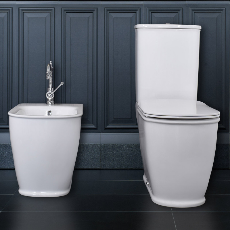 EPOCA - Sanitari bagno filomuro a terra vaso monoblocco con cassetta integrata sedile soft close e bidet stile retrò